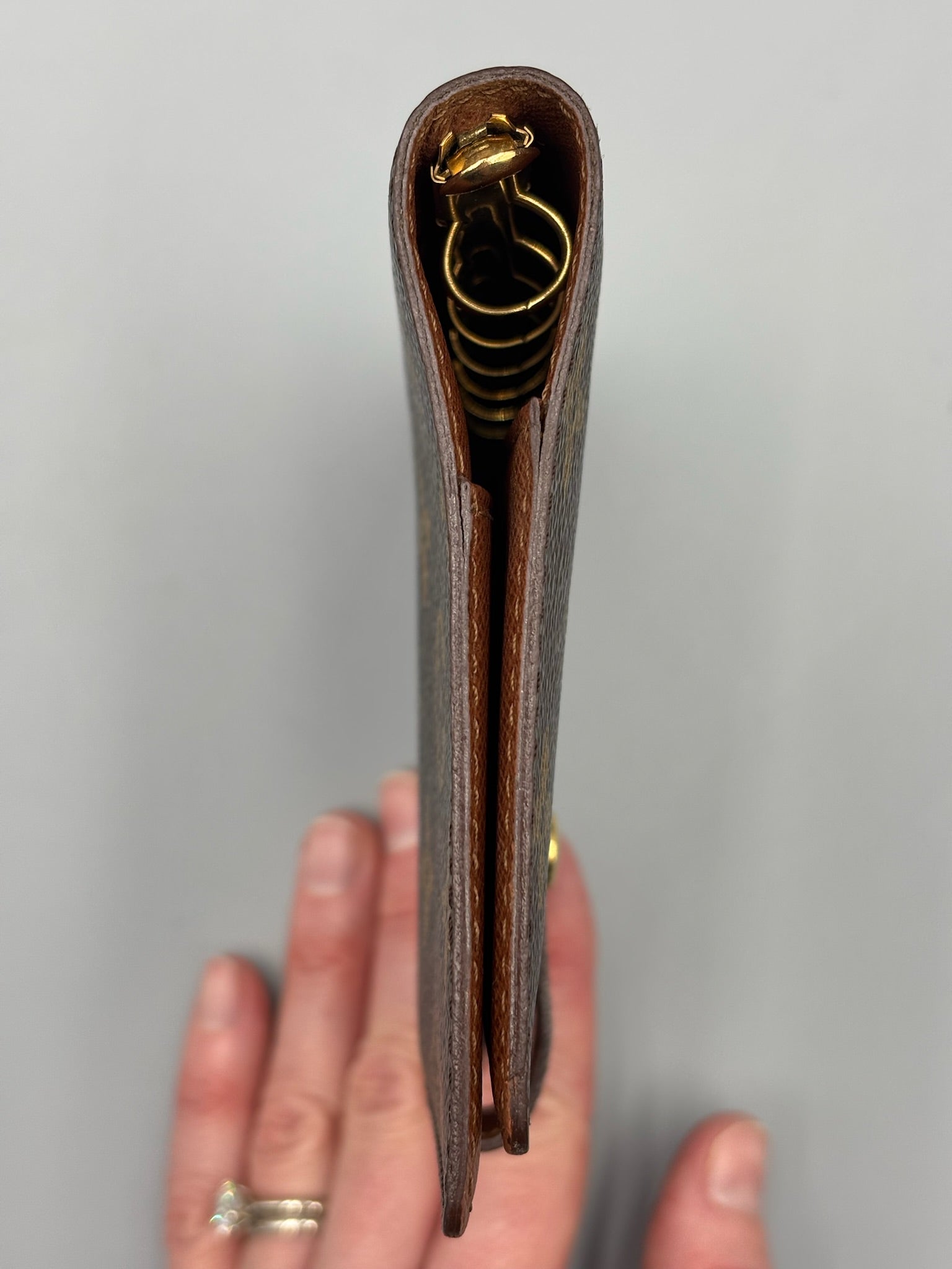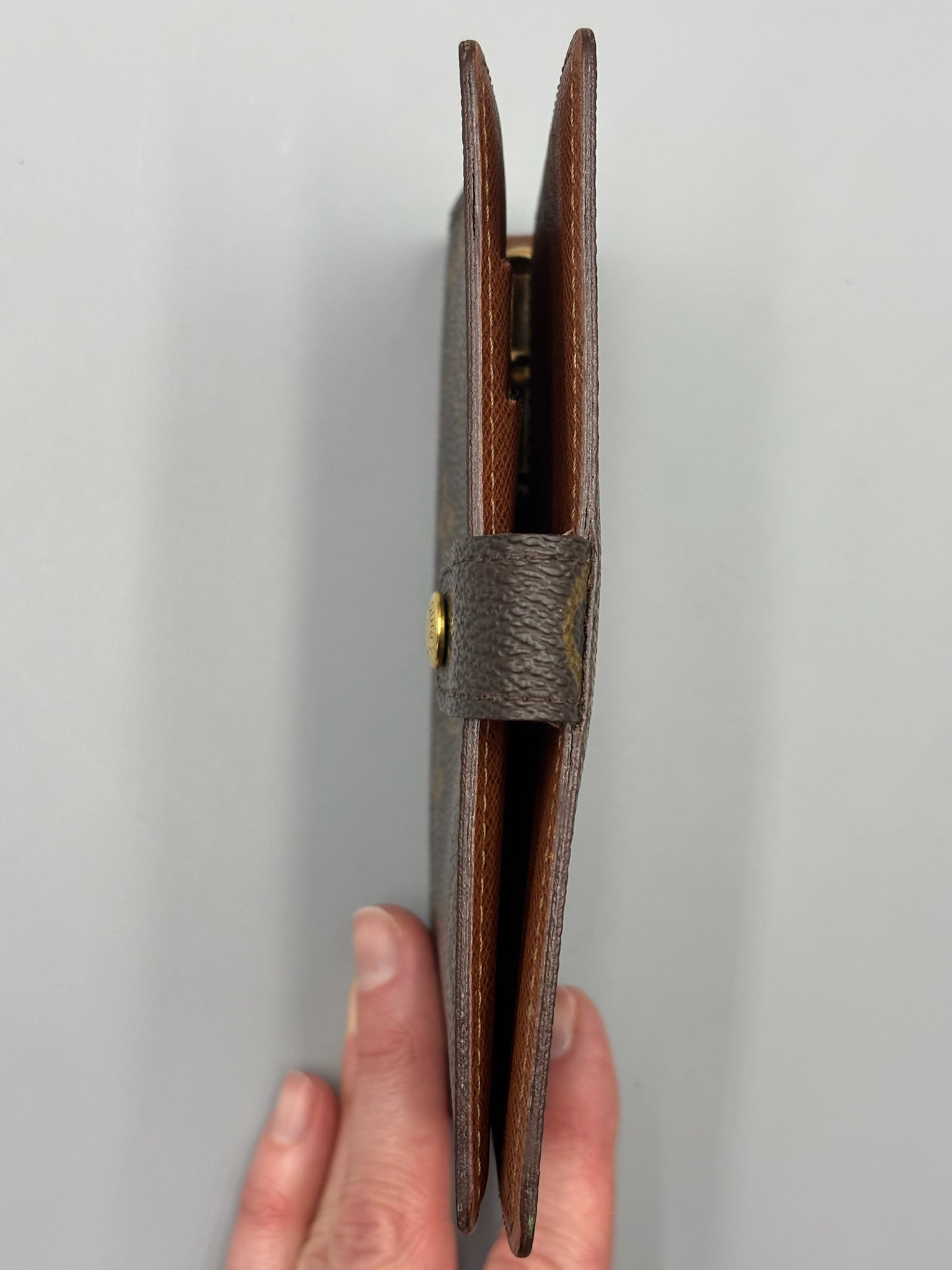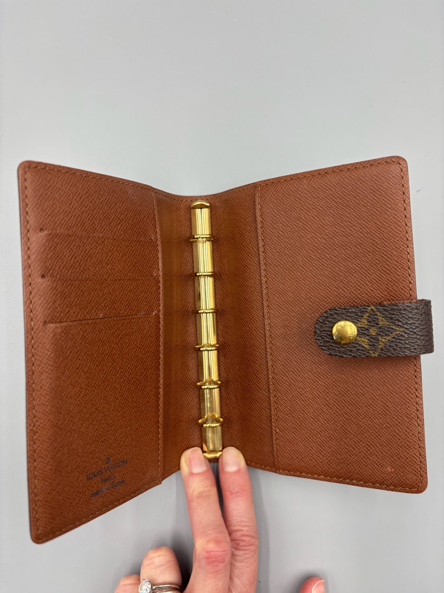 Brown and tan monogram coated canvas Louis Vuitton Agenda Cover PM with brass hardware, brown leather interior, dual slit pockets at interior walls, three card slots and brand stamp at interior.