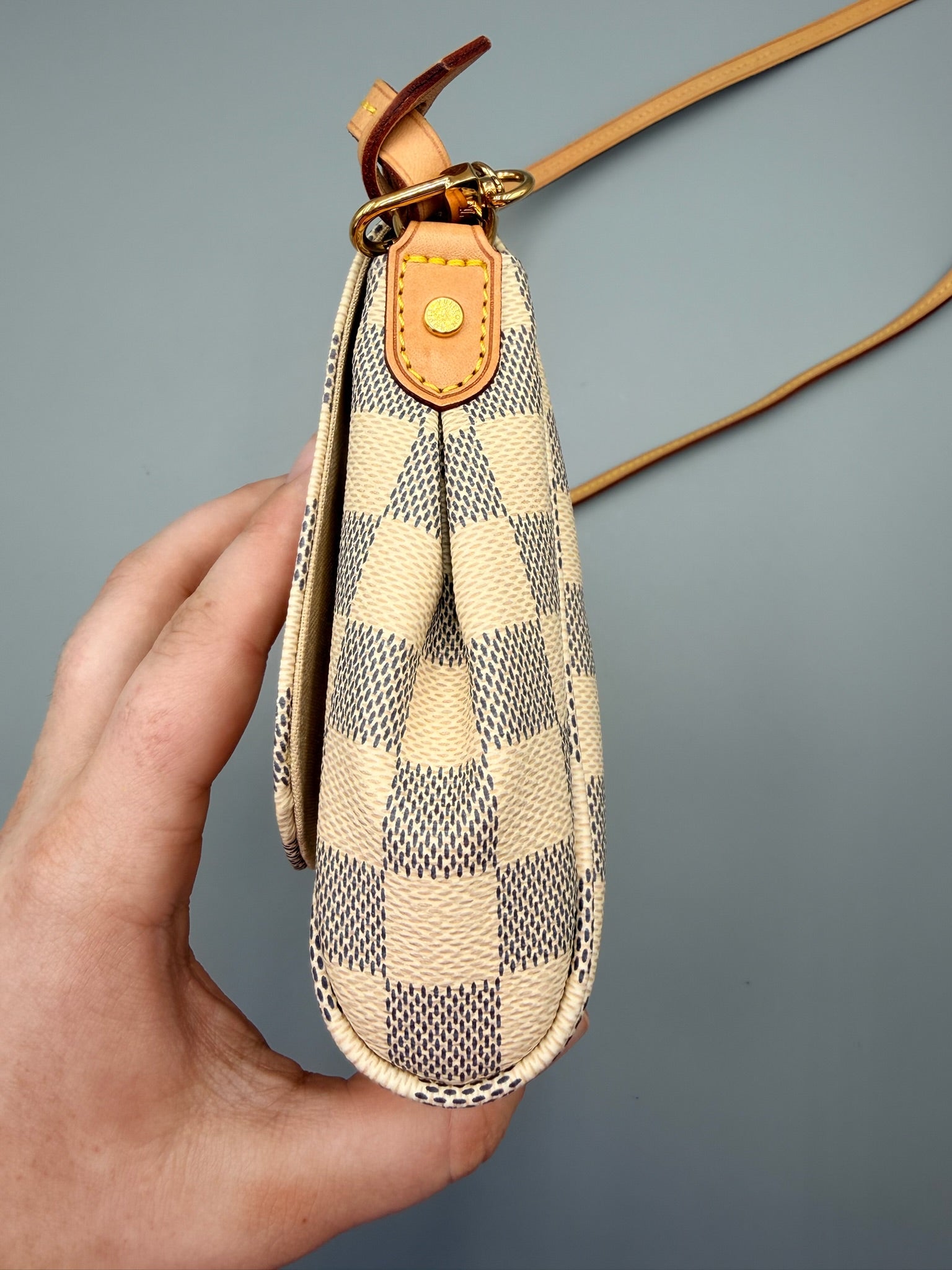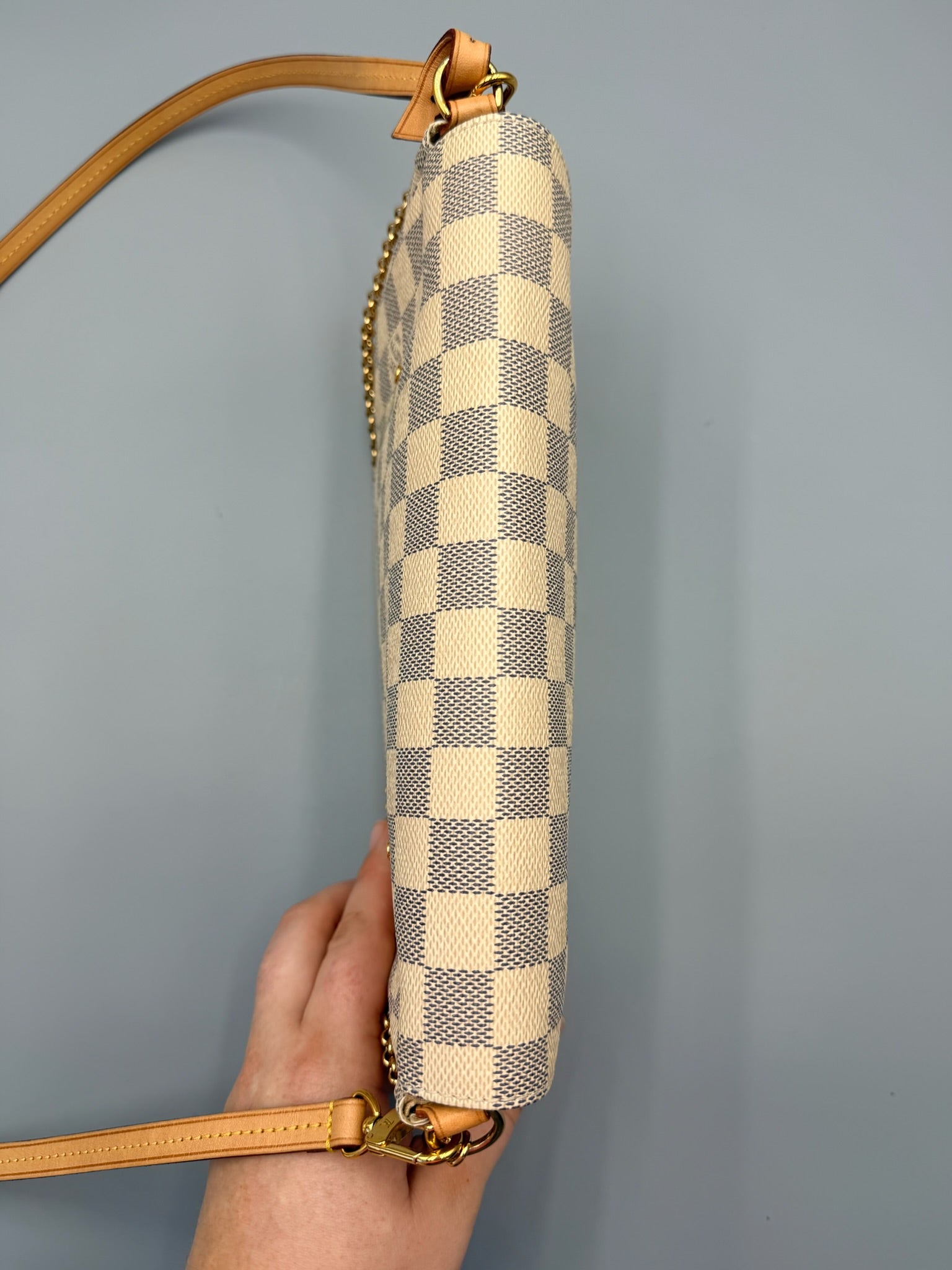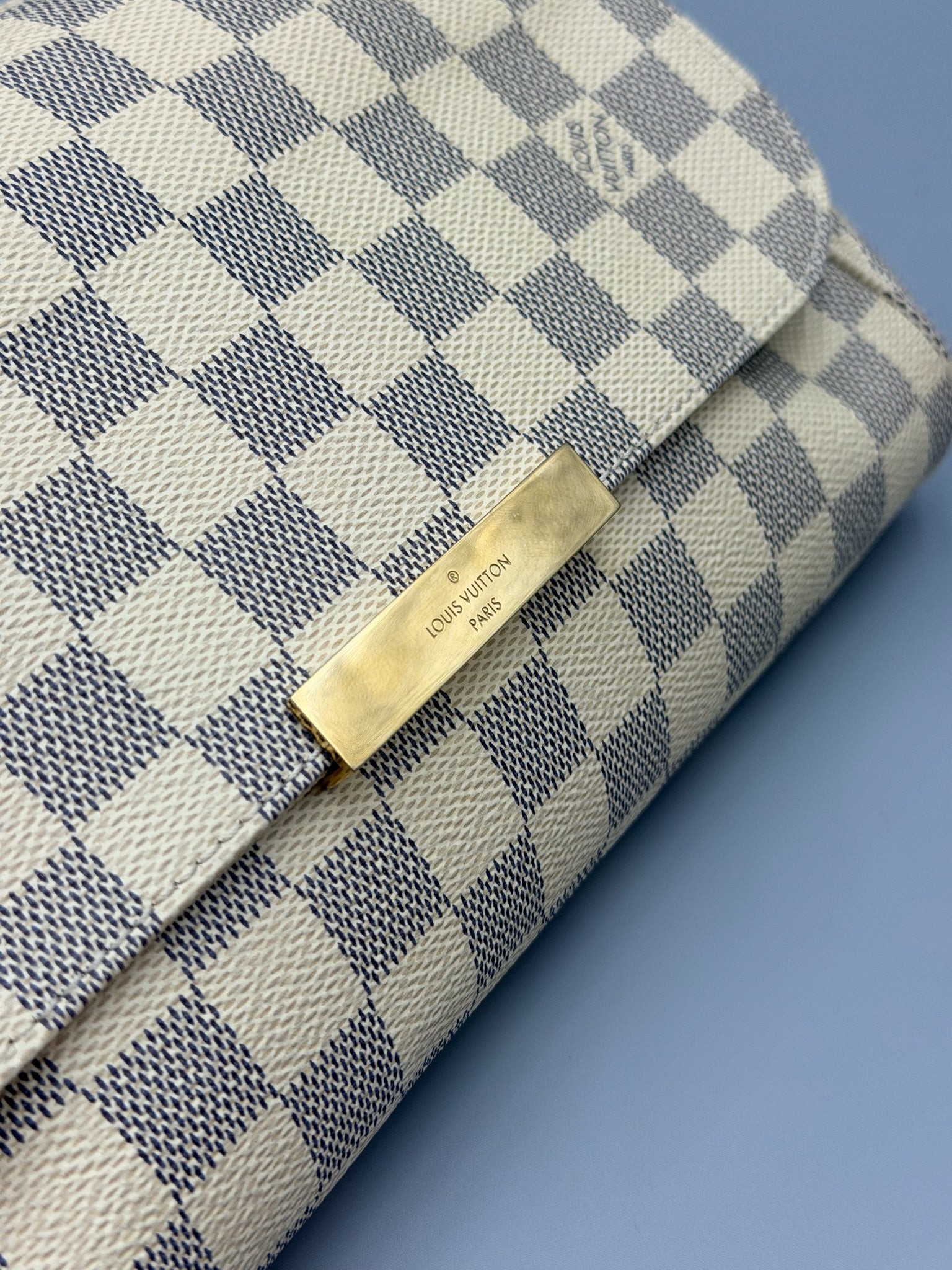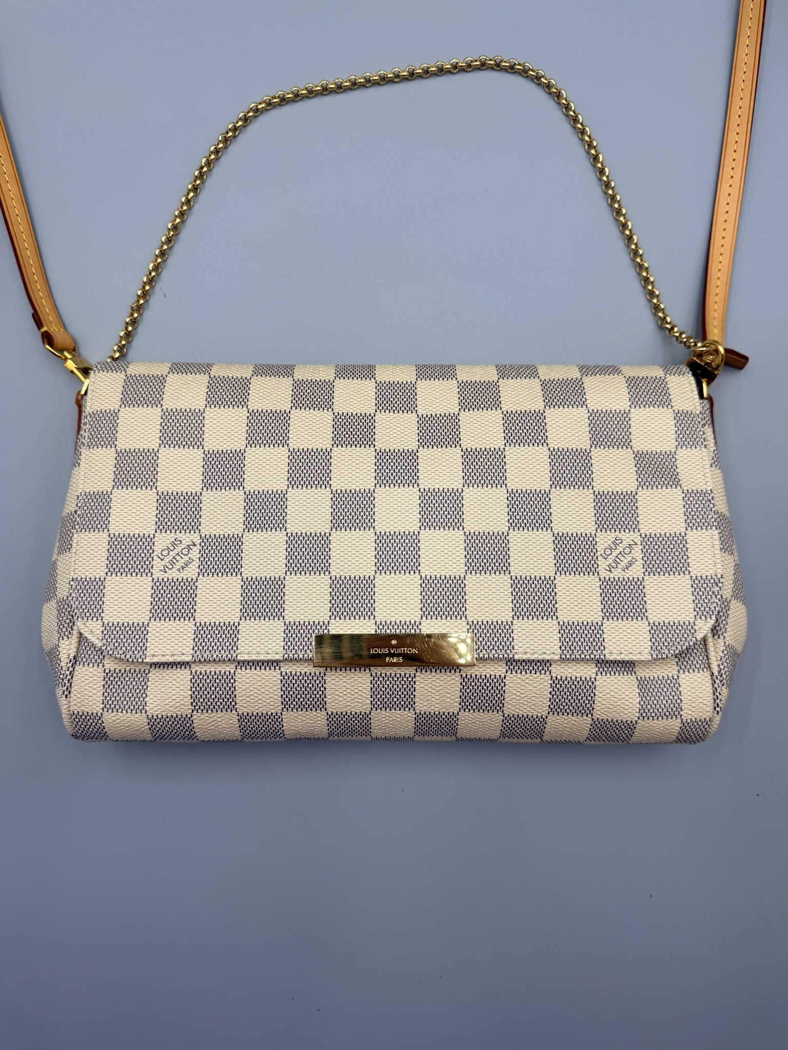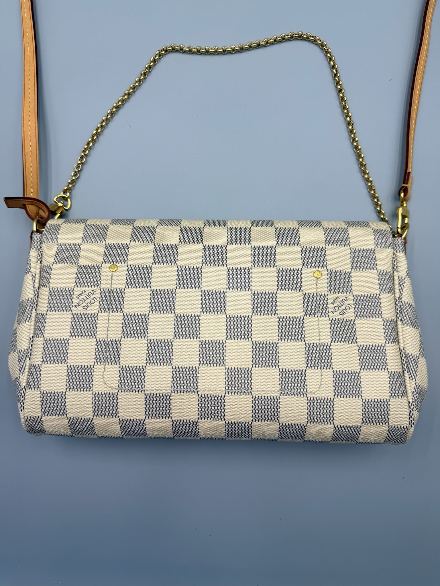 This Louis Vuitton Favorite Handbag Damier MM, crafted in damier azur coated canvas, features a long leather strap, wristlet chain, LV plated logo and gold-tone hardware. Its flap closure opens to a neutral fabric interior with slip pocket.