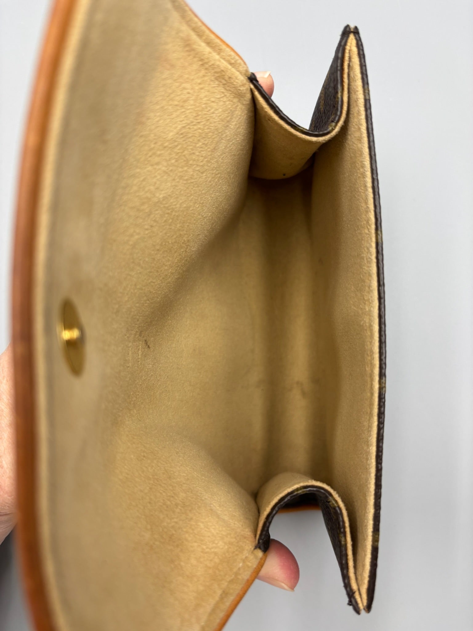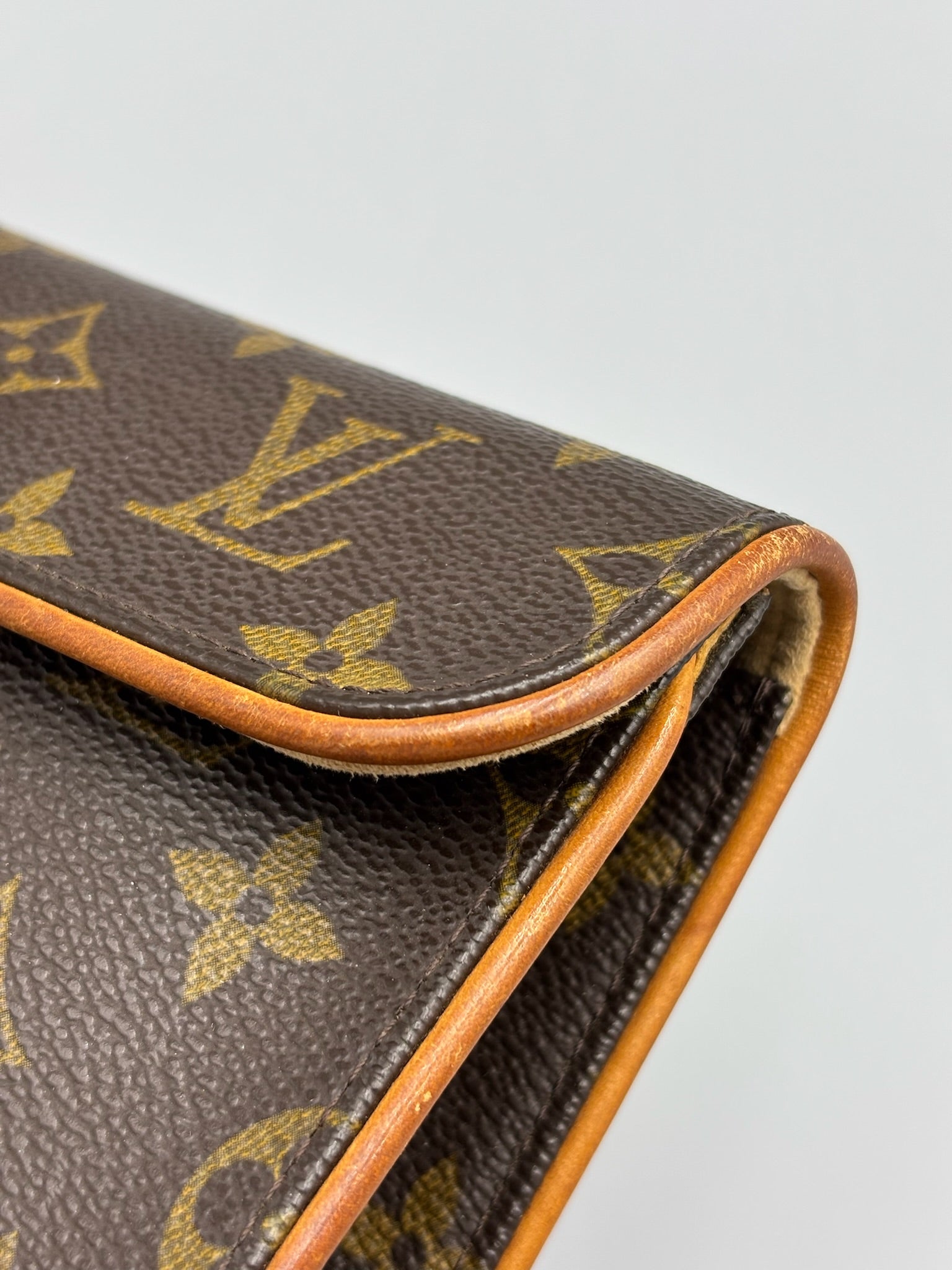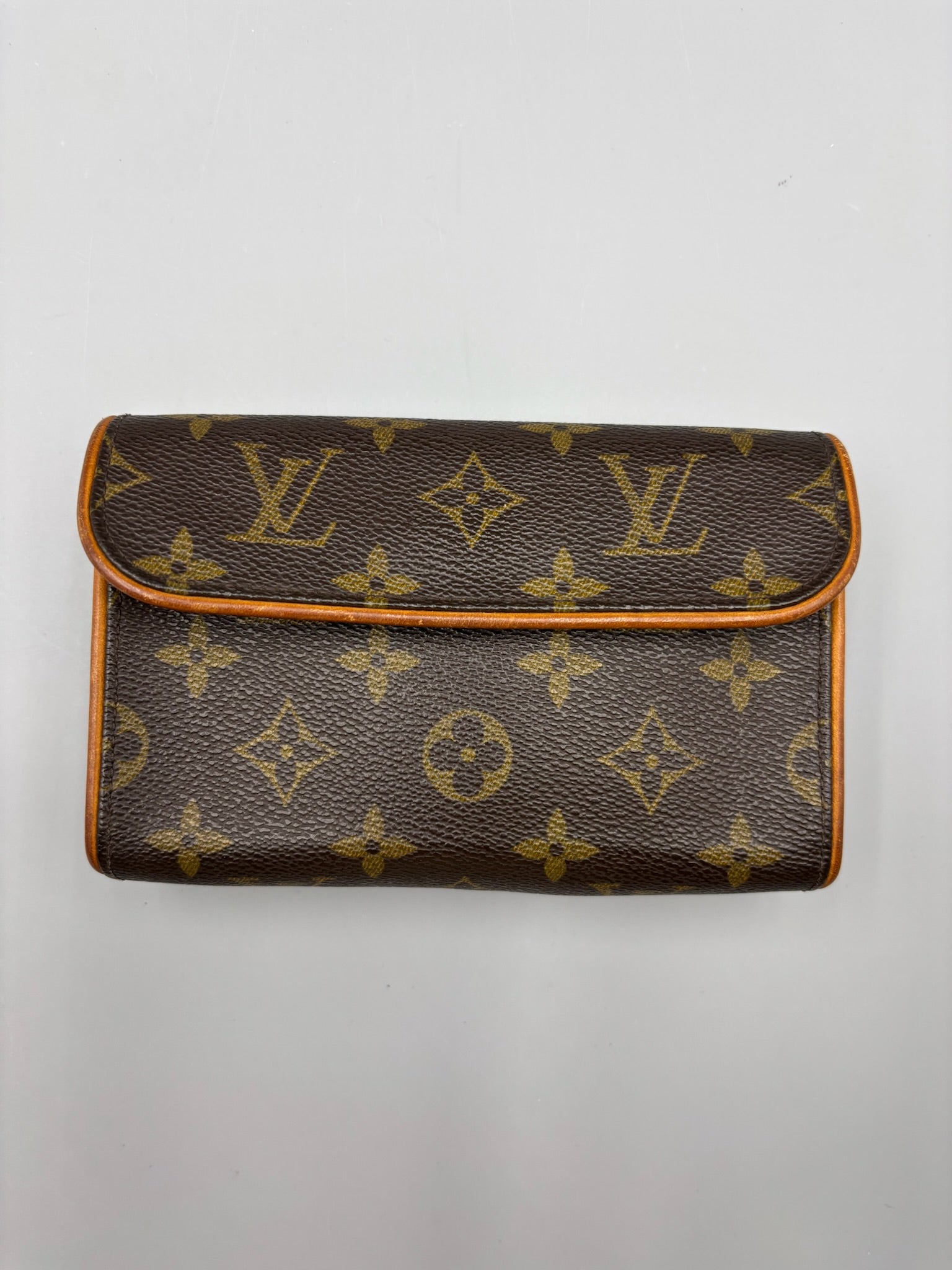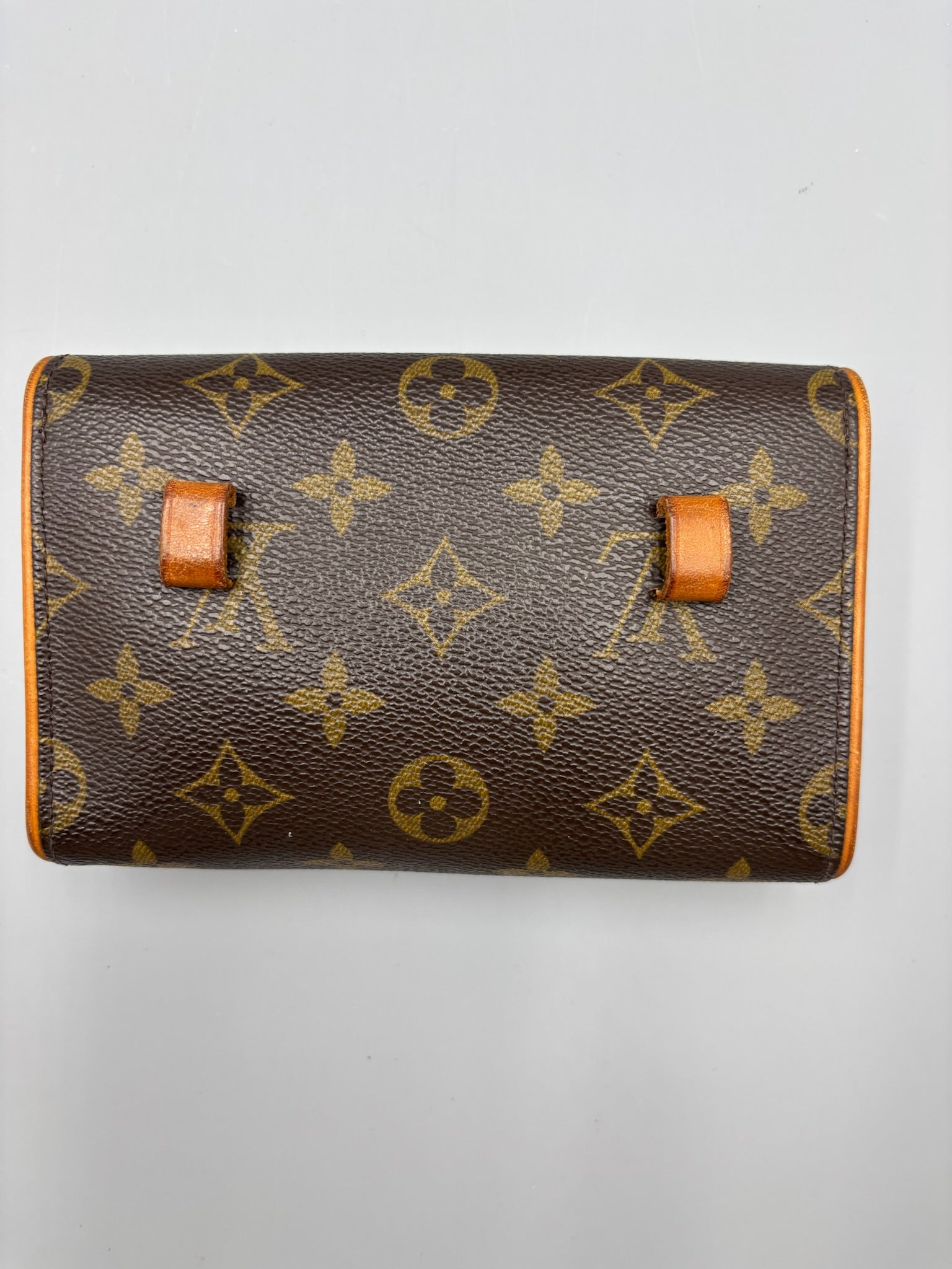 This Louis Vuitton Florentine Pochette Monogram Canvas, crafted from brown monogram coated canvas, features an adjustable leather snap fastener belt and gold-tone hardware. Its flap with magnetic closure opens to a beige microfiber interior.
