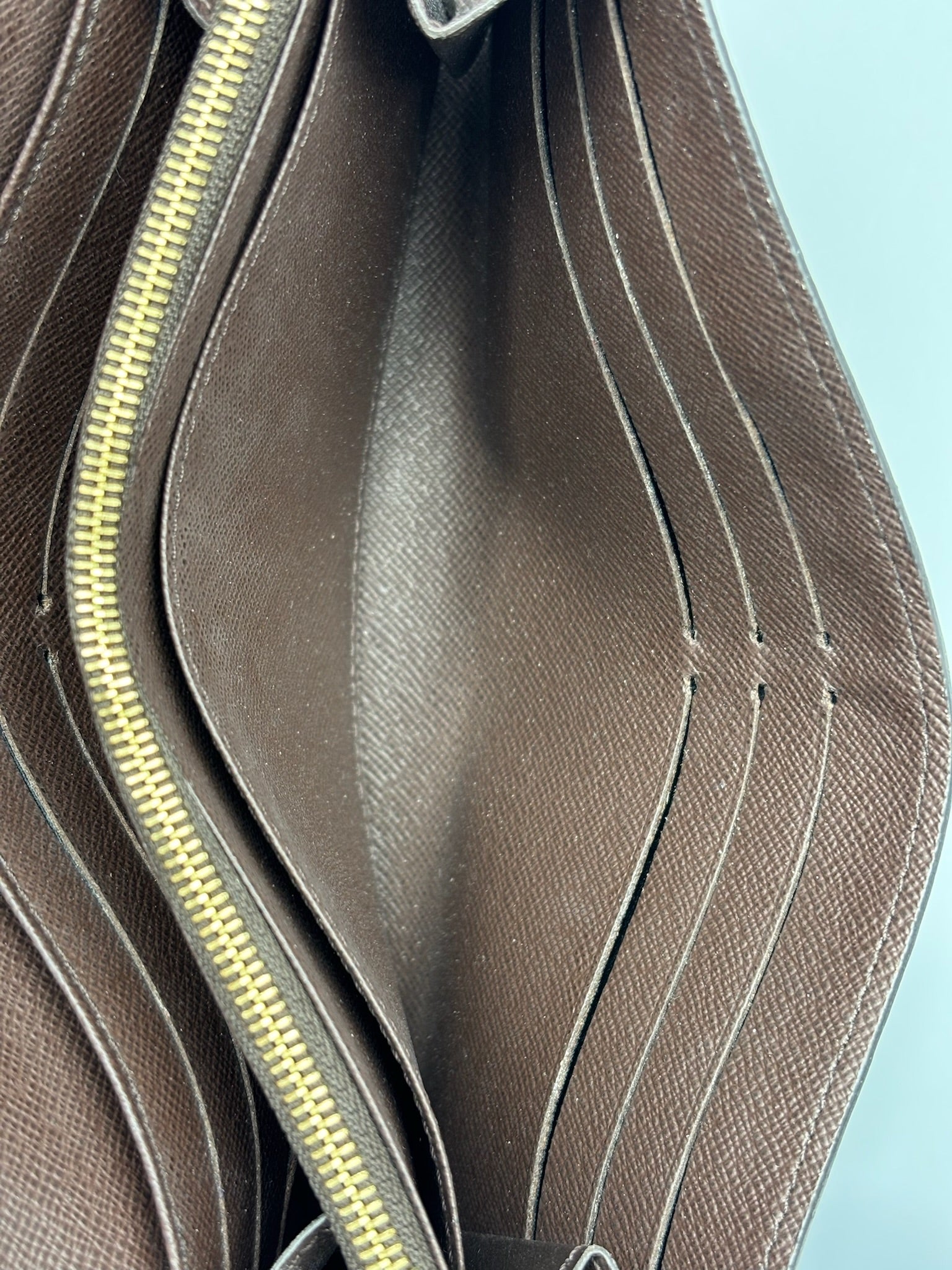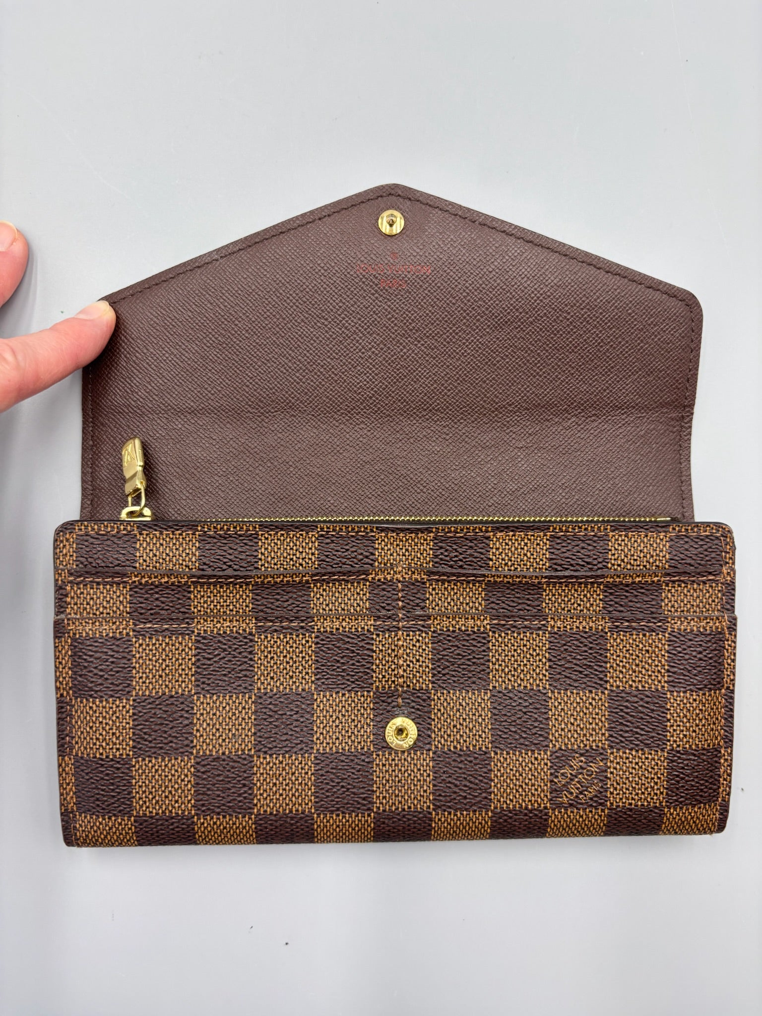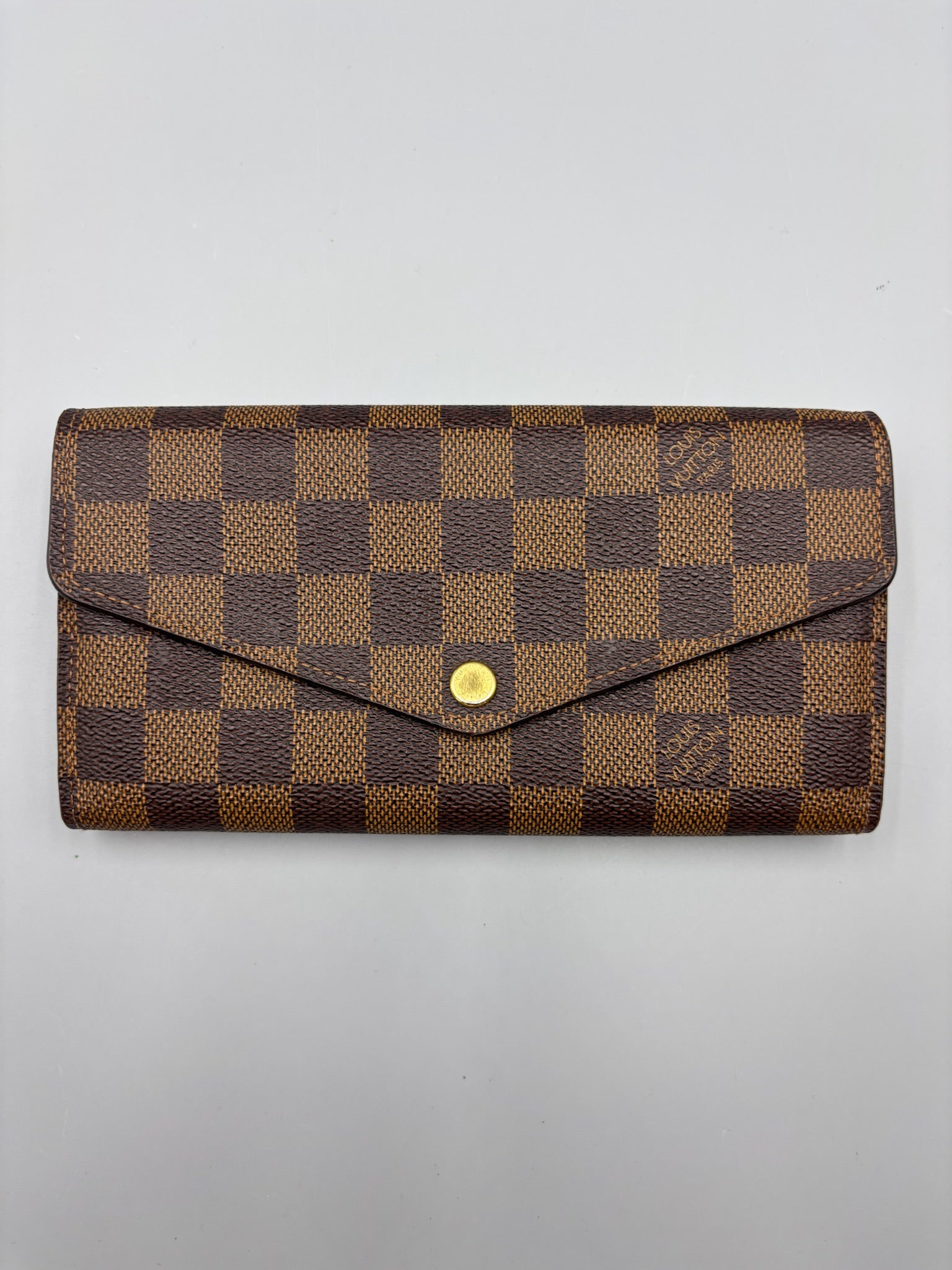 This authentic Louis Vuitton Sarah Wallet NM Damier is your perfect small accessory. Crafted in damier ebene coated canvas, this versatile wallet features an envelope-style frontal flap with snap button closure and gold-tone hardware accents. It opens to a brown leather-lined interior with multiple card slots, and middle zip compartment perfect for storing all bills, cards and coins.