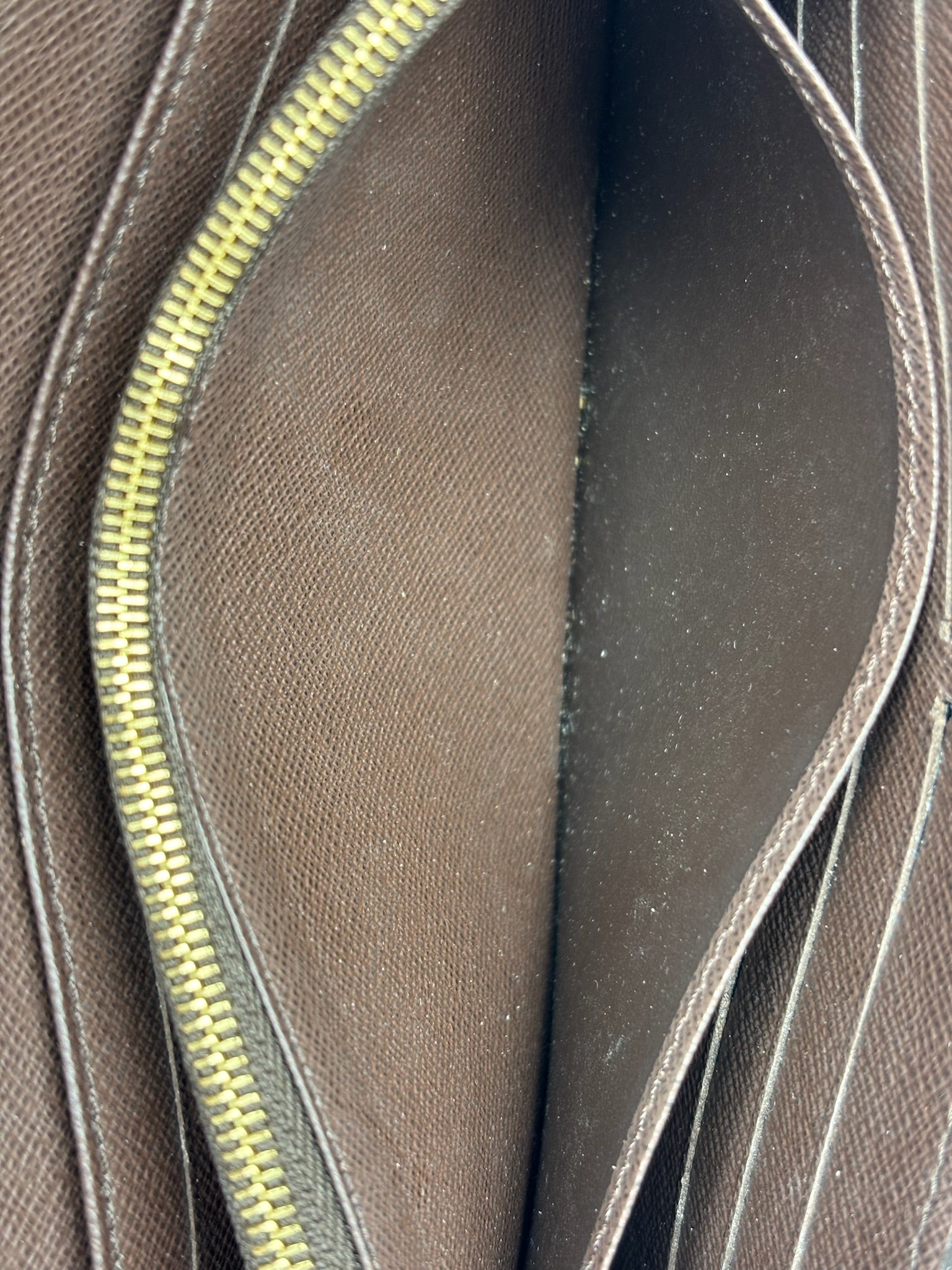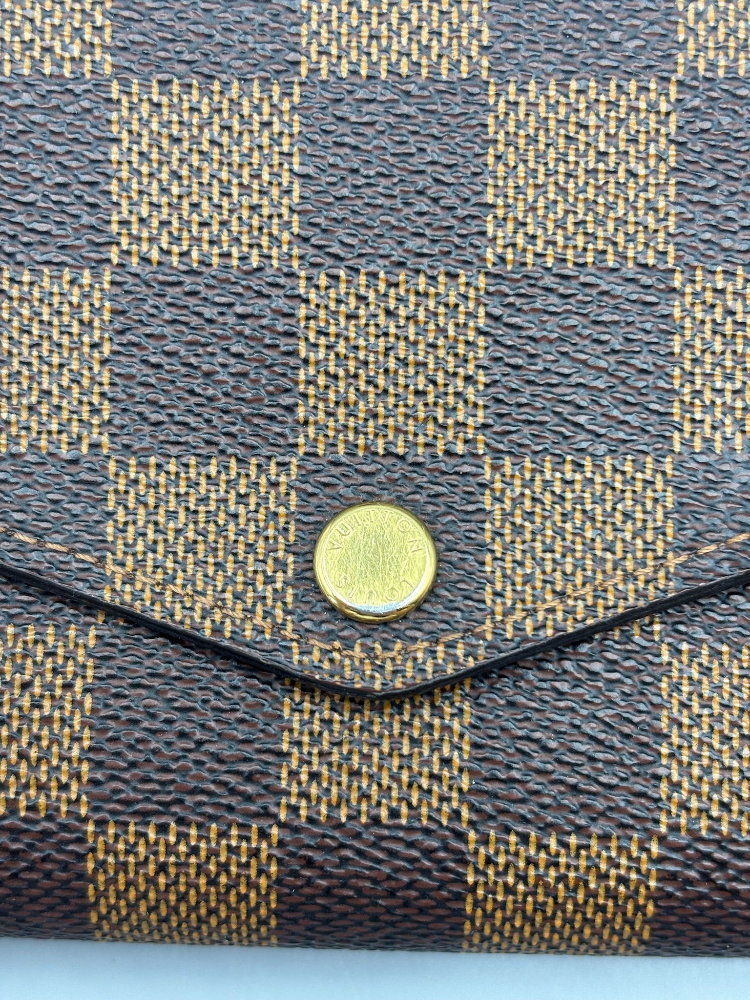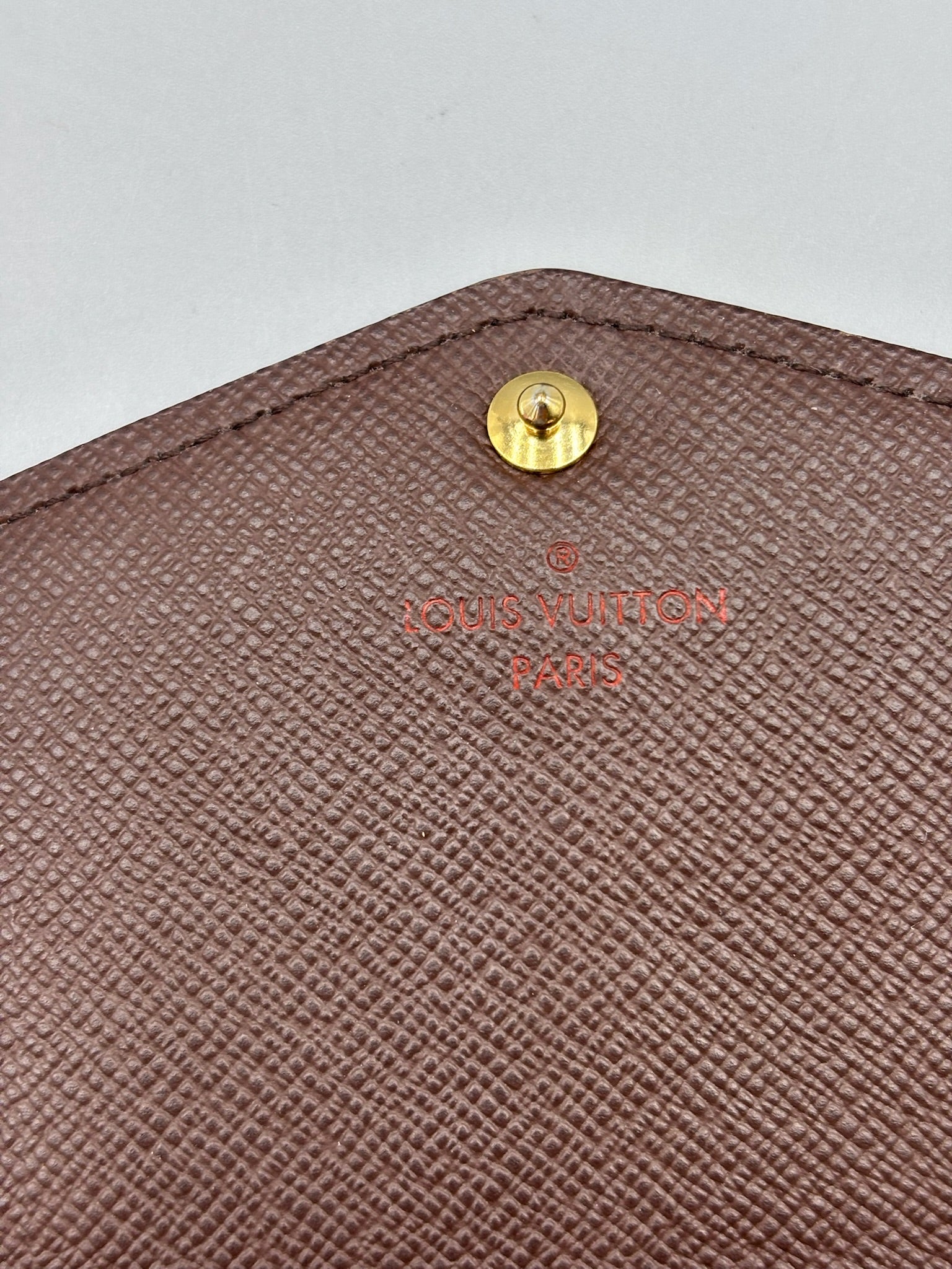 This authentic Louis Vuitton Sarah Wallet NM Damier is your perfect small accessory. Crafted in damier ebene coated canvas, this versatile wallet features an envelope-style frontal flap with snap button closure and gold-tone hardware accents. It opens to a brown leather-lined interior with multiple card slots, and middle zip compartment perfect for storing all bills, cards and coins.